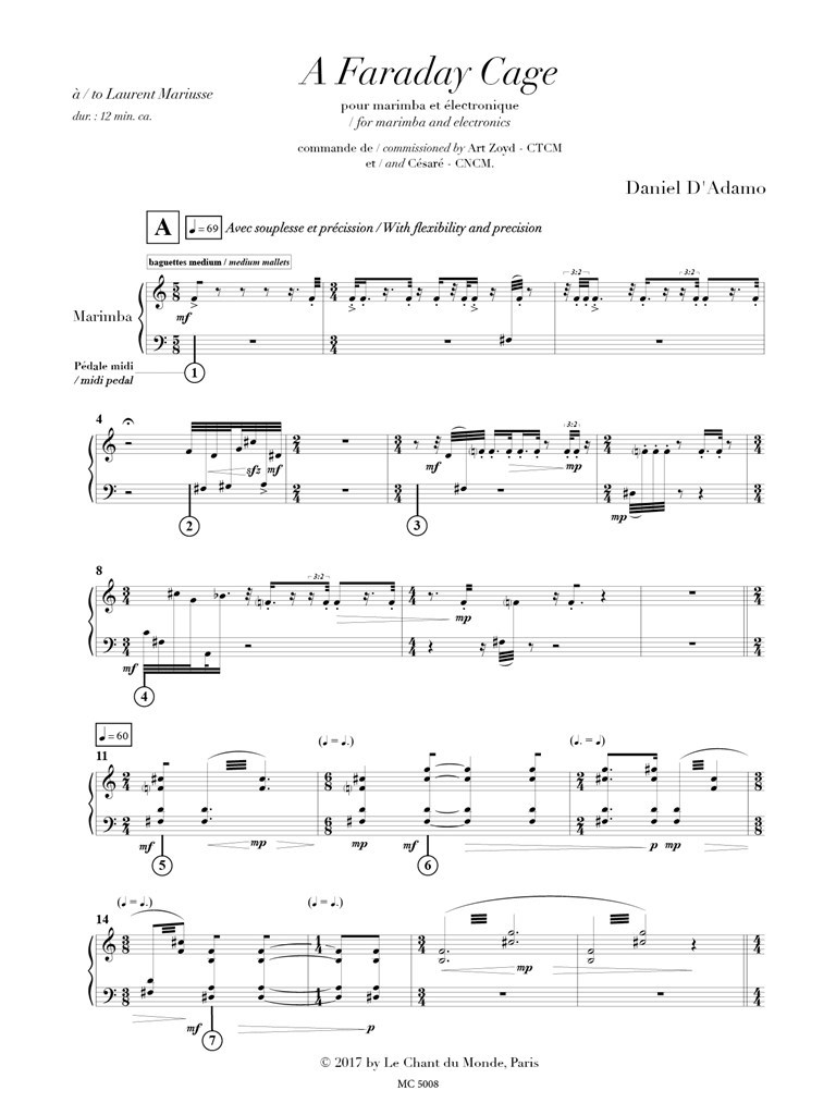 “A Faraday cage” was commissioned by Art Zoyd - CTCM of Valenciennes and by Césaré-CNCM of Reims, with the support of GRAME-CNCM of Lyon, France. It was first performed by Laurent Mariusse on June 29, 2016, as part of the Manifeste-Ircam Festival in Paris.