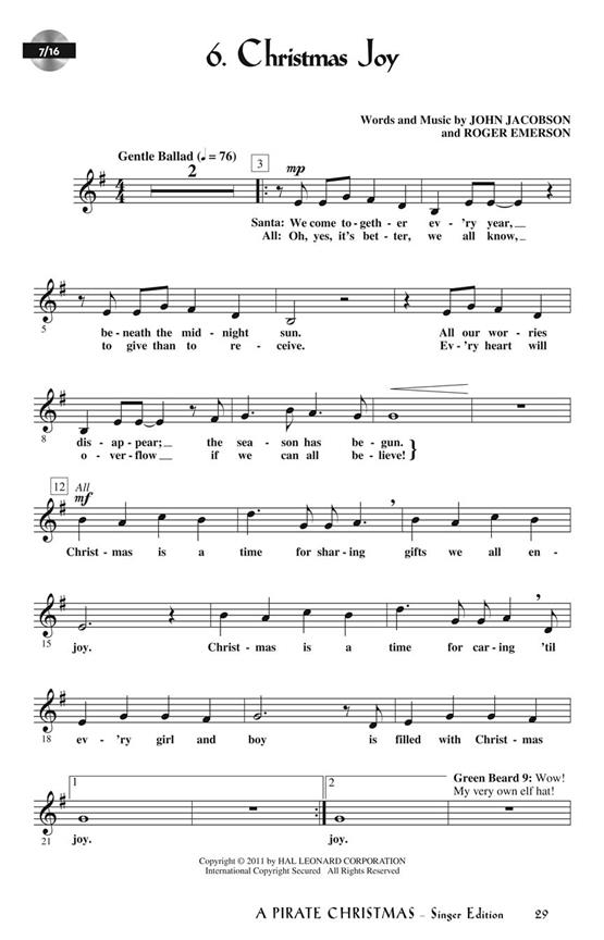 Noël approche à grands pas et les lutins sont épuisés et lassés du froid ! Quelques jours de détente sous le soleil chaleureux d'une île paradisiaque, c'est exactement ce qu'il leur faut… plongée avec tuba, ramassage de coquillages, construction de châteaux de sable, surf sur les vagues derrière cet immense bateau pirate… Quoi ? Des pirates ?! ARRRR !! À l'abordage, moussaillons ! Préparez-vous à une aventure extraordinaire : le légendaire Barbe Blanche (alias le Père Noël) et les lutins vont initier une bande de joyeux lurons hauts en couleur à l'univers des vrais trésors. Les élèves du primaire et du collège passeront un moment inoubliable avec ce spectacle de Noël de 35 minutes, qui propose huit chansons originales pour chœur et un livret de plus de 75 rôles parlés, facilement adaptable à des distributions de différentes tailles. Le guide pédagogique inclut également une chorégraphie, un guide de production utile et des objectifs pédagogiques conformes aux programmes scolaires pour chaque chanson. Disponibles séparément : Guide pédagogique, Coffret de 5 partitions, CD de prévisualisation (avec chant), Coffret de prévisualisation (1 CD de prévisualisation, 1 livre pour chanteur), CD d’interprétation/accompagnement, Kit d’interprétation/CD (Guide pédagogique, 20 livres pour chanteur, CD d’interprétation/accompagnement). Durée : environ 35 minutes. Recommandé pour les élèves du CM1 à la 5e.