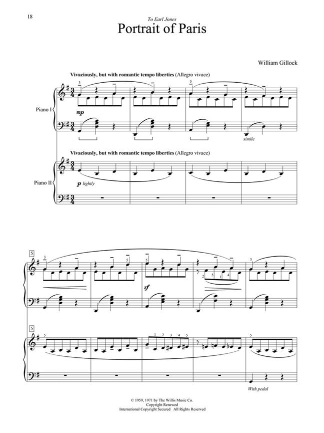Four great Gillock originals arranged by the composer for 2 pianos, 4 hands. Each first piano part stands solidly as a solo work, but Gillock's creation of the second piano part enhances the music brilliantly, often unexpectedly, with layers of stunning harmonies and inner voicings. Titles: Carnival in Rio · On a Paris Boulevard · Portrait of Paris · Viennese Rondo. Includes a duplicate score insert for the second piano.