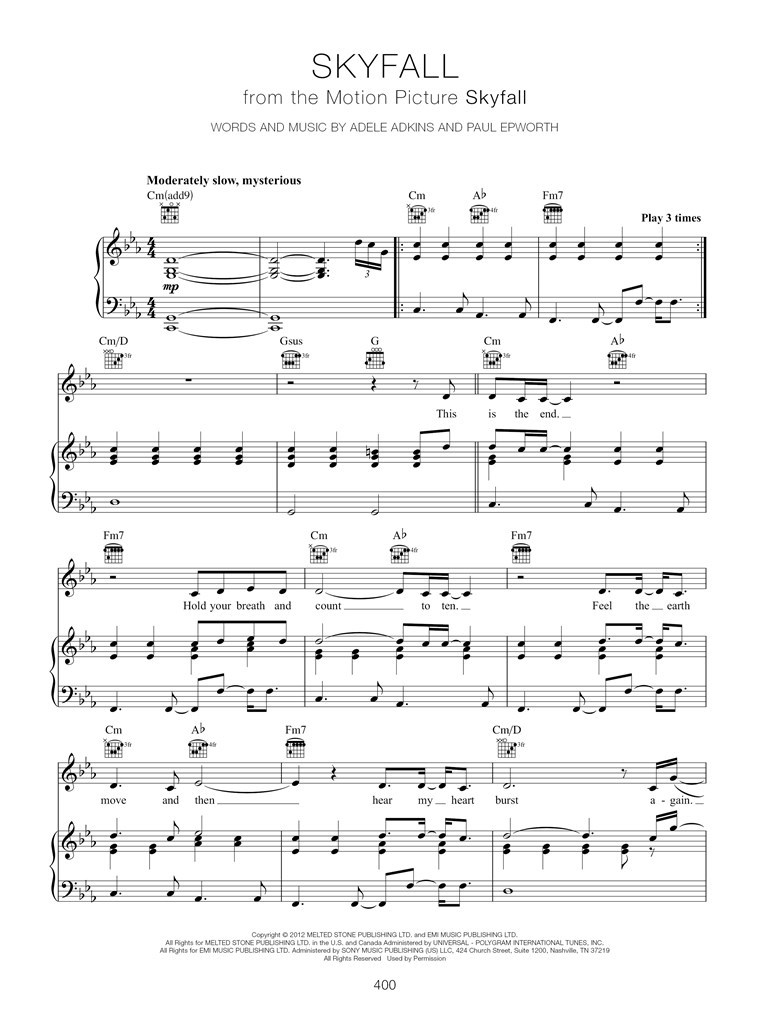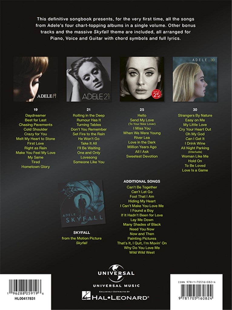 In this brand-new updated edition, Adele: The Complete Collection presents all the songs from Adele's four chart-topping albums in a single songbook. New album 30, additional bonus tracks and the massive Skyfall theme are included, arranged for Piano, Voice and Guitar with chord symbols, chord diagrams and full lyrics. In this newly-published folio, all songs are presented chronologically by album, with details on the bonus tracks included at the back. For pianists, vocalists and guitarists' comprehensive fix of Adele sheet music, The Complete Collection boasts all the songs from the British queen of the ballad that you could ever want to play.