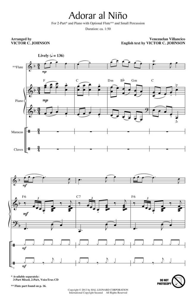 Voici un Villancico vénézuélien lumineux dans un cadre chaleureux et coloré pour jeunes voix avec piano, flûte et percussions. Excellent choix pour Noël ou un concert, les parties vocales sont accessibles pour garantir confiance et succès ! Disponible séparément : mixé en 3 parties, en 2 parties, VoiceTrax CD. Durée : environ 1:50.