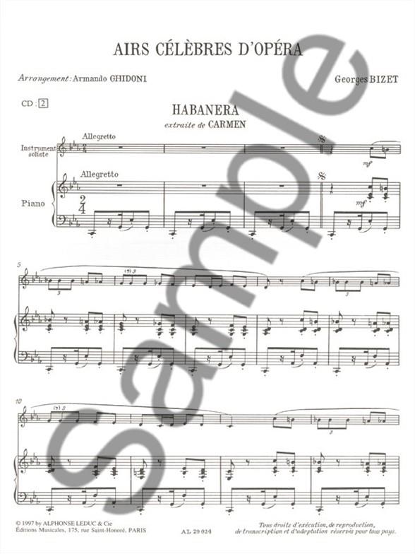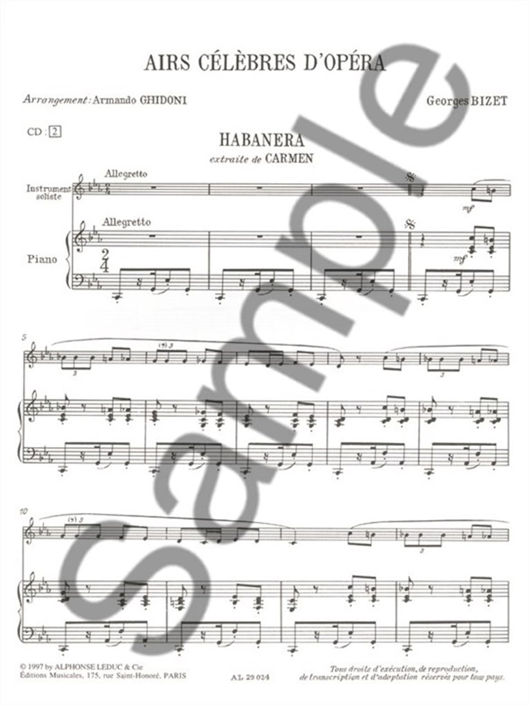 Airs Celèbres D'Operas (Vol. 1) for Alto Saxophone or B Flat Clarinet and Piano is an anthology of famous pieces arranged by Armando Ghidoni. Written for intermediate players, this first volume features five pieces which can be played along with the CD which includes the Piano part for each song. The five pieces are: - Habanera, from Carmen by Bizet - Che faró senza Euridice from Orfeo Ed Euridice by Gluck - E lucevan le stelle from Tosca by Puccini - Questa o quella per me pari sono from Rigoletto by Verdi - Brindisi from LaTraviatta by Verdi Armando Ghidoni is an Italian musician really famous in France. He composed and arranged a large variety of pieces, influenced by French Impressionism and incorporating jazz rhythms to his music. He composed religious pieces, operas and numerous pieces of chamber music among others.