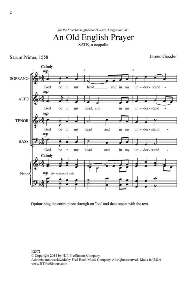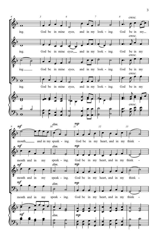 God be in my head is the prayer that composer James Gossler has set to music. The beseeching lyrics call for unpretentious vocal lines and soothing cadences and Gossler delivers beautifully. This modest and entreating petition will honor any service.