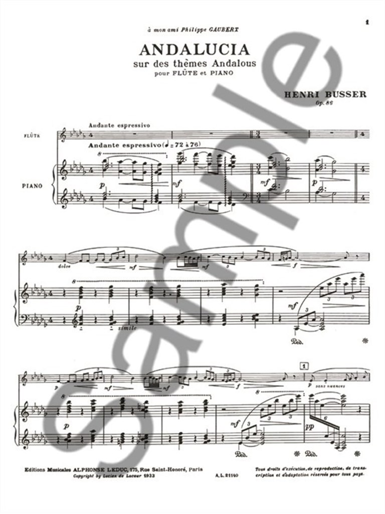 French composer, Henri Busser entered the Paris Conservatoire in 1889. He won the 1893 Prix de Rome and led a highly successful career as a composer, conductor, teacher and organist. His compositions for a variety of instruments are exceptional, Andalucia for Flute and Piano being no exception. As reflected in Andalucia, which is named after the popular Spanish area of the same name, Busser 's compositional style was sophisticated, yet true to the 19th century French tradition. Elements of Andalucia include, chromaticism, exploitation of tonality, complex rhythms and semiquaverflourishes, amongst other aspects. For all advanced Flute players, Busser 's Andalucia is essential to a varied repertoire.