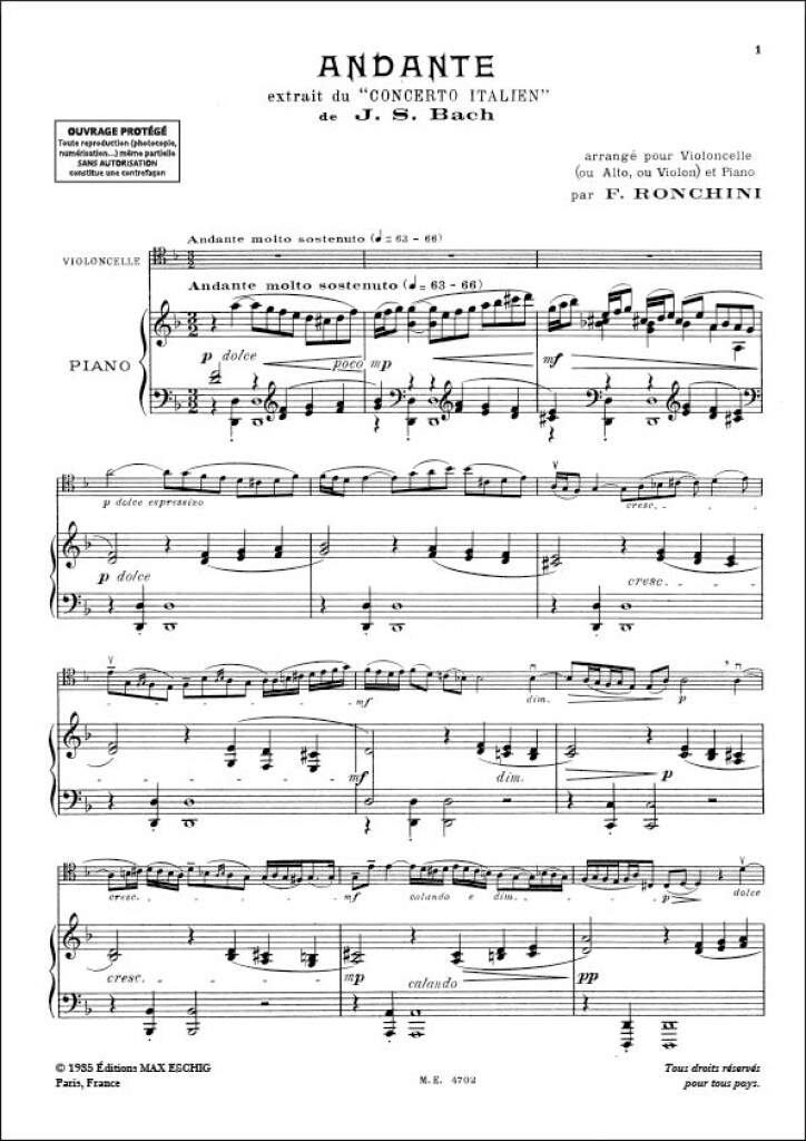 Andante/Conc Italien Vlc/Piano BACH JOHANN SEBASTIAN