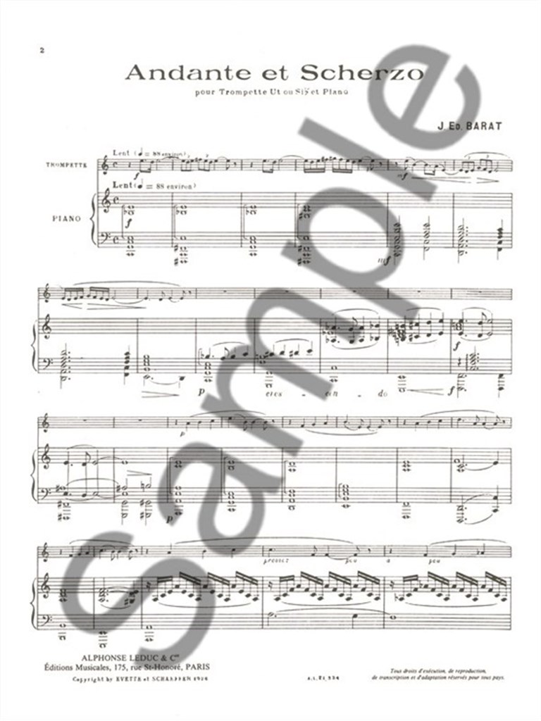 Joseph Edouard Barat (1882-1963) is best known for his concertos and compositions for solo wind and orchestra. His sympathy for wind music is thought to have been influenced by his work as a bandmaster with the French Army, from which his compositional expertise has derived. His Andante et Scherzo for Trumpet and Piano begins in a slow, common time, avoiding clear tonality until it cadences in C major. The second movement is also in C major yet provides contrast by its compound meter and quick pace. Barat 's talent is proven when he cleverly combines the two movementsduring the coda. These musical elements, along with many other features, create a highly enjoyable performance and is a necessity for any trumpeter's repertoire.
