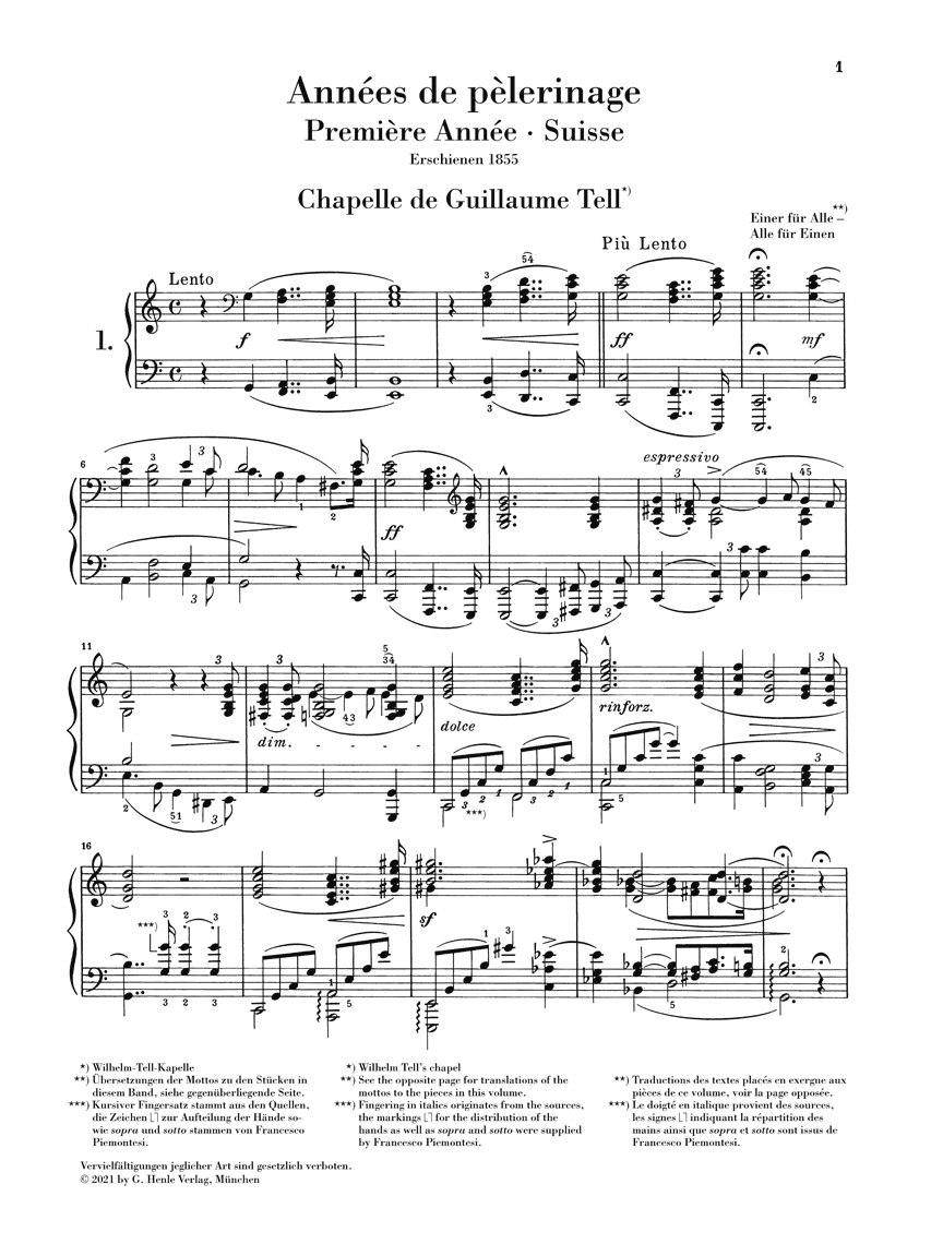 Les trois volumes des Années de pèlerinage appartiennent au noyau central de l’œuvre pour piano de Liszt. Dans le premier volume, Suisse, le compositeur traite des impressions recueillies lors d’un long séjour en Suisse, en 1835/36. Les pièces, en majeure partie publiées dès 1840/41, furent ensuite substantiellement révisées par Liszt, et le recueil enrichi de deux numéros, pour atteindre sa forme définitive en 1855. Pour la refonte de l’édition urtext Henle, il a été possible de prendre pour la première fois en compte l’exemplaire – redevenu accessible – ayant servi à la gravure de la première édition. La préface et les remarques exposent de manière détaillée la réévaluation des sources qui en a résulté, ainsi que d’autres avancées dans la recherche lisztienne. Pour la réalisation des doigtés, nous avons pu compter sur le pianiste suisse Francesco Piemontesi.