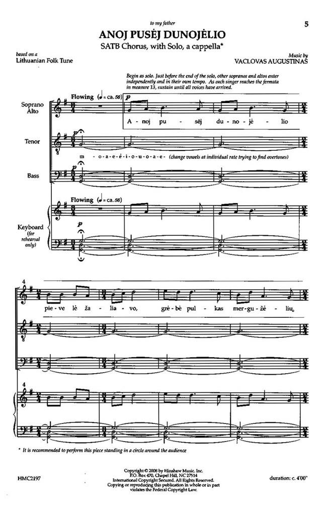 C’est la dernière addition à la série Songs Of The World. La mélodie simple est une chanson lituanienne traditionnelle que le compositeur a apprise enfant. La fusion d’harmonie tonale traditionnelle et de polyphonie imitative avec des techniques contemporaines crée une cacophonie sonore qui enthousiasme aussi bien le public que les chanteurs.