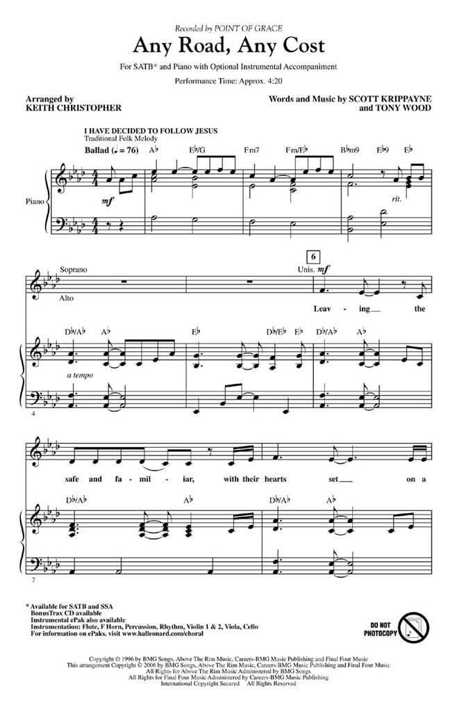 Initialement enregistrée par Point of Grace, cette chanson d’engagement est parfaite pour les missions et les services sur le thème des missions. Sur n’importe quelle route, à tout prix. Où que Tu mènes, nous te suivrons. Disponibles séparément : SATB, SSA, Instrumental ePak (parties pour flûte, cor en fa, percussions, rythme, violon 1 & 2, alto et violoncelle) et CD BonusTrax (08745149). Durée de la représentation : Environ 4:20