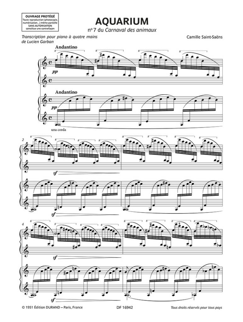 Le Carnaval des animaux a été conçu dans un petit village autrichien, alors que Camille Saint-Saëns travaillait à sa 3e Symphonie avec orgue, opus 78. Craignant que cette fantaisie humoristique ne fasse perdre le sérieux de son œuvre et ne nuise à sa réputation, il en interdit la publication de son vivant. Au sein de cette « Grande Fantaisie zoologique » qui comporte quatorze numéros, « Aquarium » se place en septième position. La version originale de cette pièce réclame un instrumentarium fourni : flûte, harmonica [célesta], pianos I et II, quatuor à cordes. Lucien Garban (1877-1959), arrangeur attitré des Éditions Durand, a écrit la transcription d'Aquarium pour piano en août 1922.Après « Le Cygne », « Aquarium » est probablement la pièce la plus connue du recueil. On peut l’entendre (son début) avant chaque projection de film en compétition dans la salle du Palais des Festivals à Cannes et de nombreux cinéastes y ont puisé un fond musical. Introduction historique en français et en anglais par Edmond Lemaître. - Nouvelle gravure.