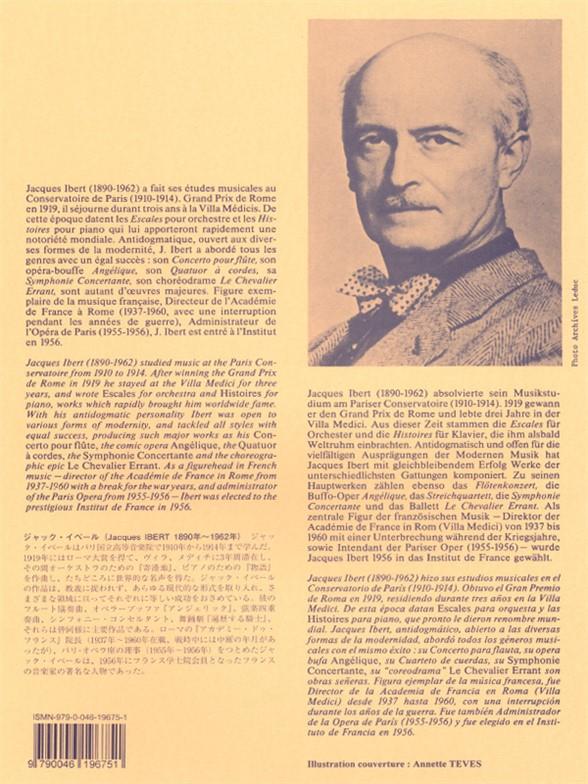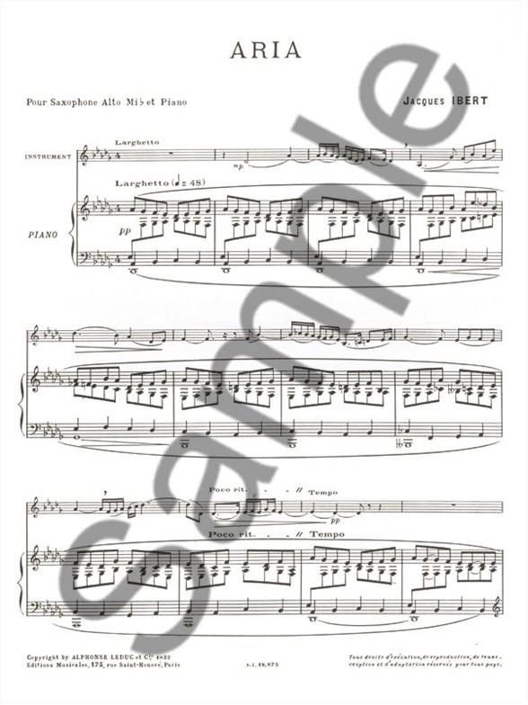 Aria, written in 1930 by Jacques Ibert (1890-1962), is a small study initially for Voice and Piano but arranged in this edition for Alto Saxophone and Piano. This version and the one for Flute and Piano are the ones most commonly used. The Alto Saxophone score is one-page long and contains technical difficulties that would make it ideal for an upper intermediate player. Its author, Jacques Ibert (1890-1962) was a neoclassical composer who won the Prix de Rome in 1919. He composed many symphonic suites, operas and seven orchestras, including 'Angelique' (1926) and 'Entertainment' (1930). He also was in charge of the Accadémie de France in the Villa Médicis (Roma) and was lateradministrator for the Paris Opera.