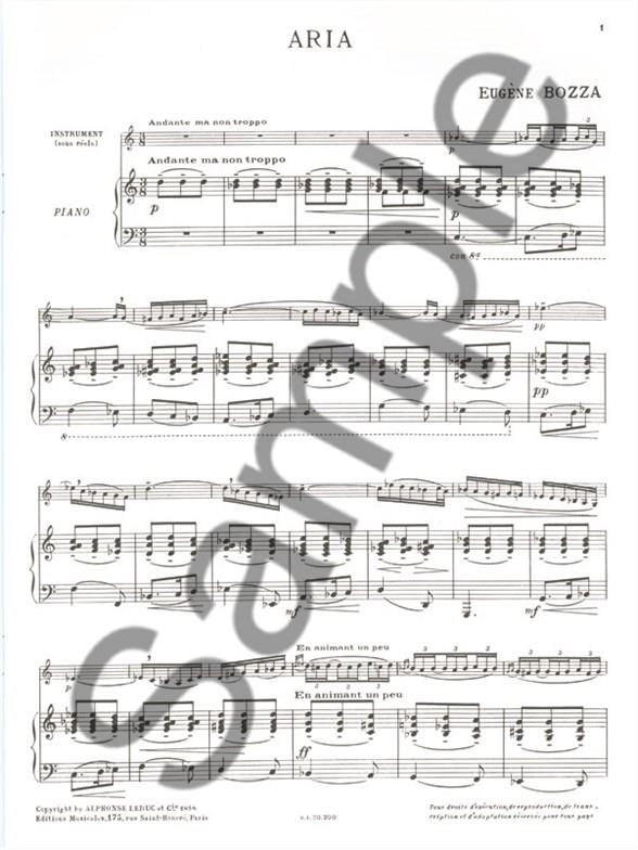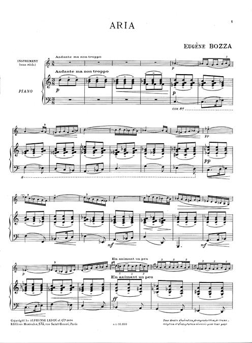 Having won many prizes at the Paris Conservatoire during the 1920s-1930s, Eugène Bozza went on to conduct the orchestra of the Opéra-Comique and to become Head of the Conservatoire in Valenciennes. As a major figure on the classical music frontline, Bozza 's compositions were well-received by audiences, Aria for Violin or Flute and Piano being no exception. This Bozza piece, adaptable for either Violin or Flute, is lyrical and graceful, displaying the beautiful, lower register of both instruments, accompanied by rich, pulsating chords in the Piano. As music educationalist, Paul Griffiths has written of Bozza 's compositions, "his works reveal melodic fluency, elegance ofstructure and a consistenly sensitive concern of instrumental capabilities. "