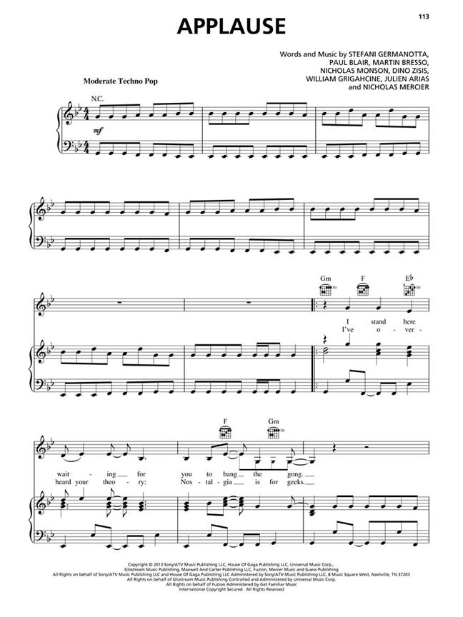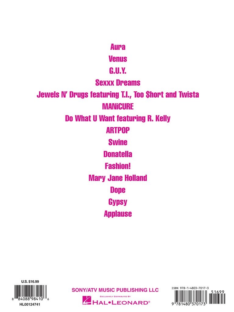 Arrangé pour piano, voix et guitare, ce recueil comprend les tubes Applause et Do What You Want, ainsi que Artpop, Donatella, Fashion !, G.U.Y. et bien d’autres.