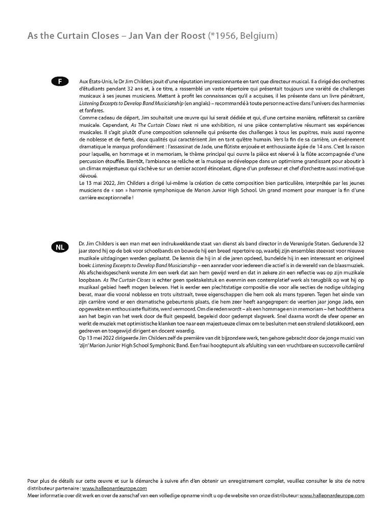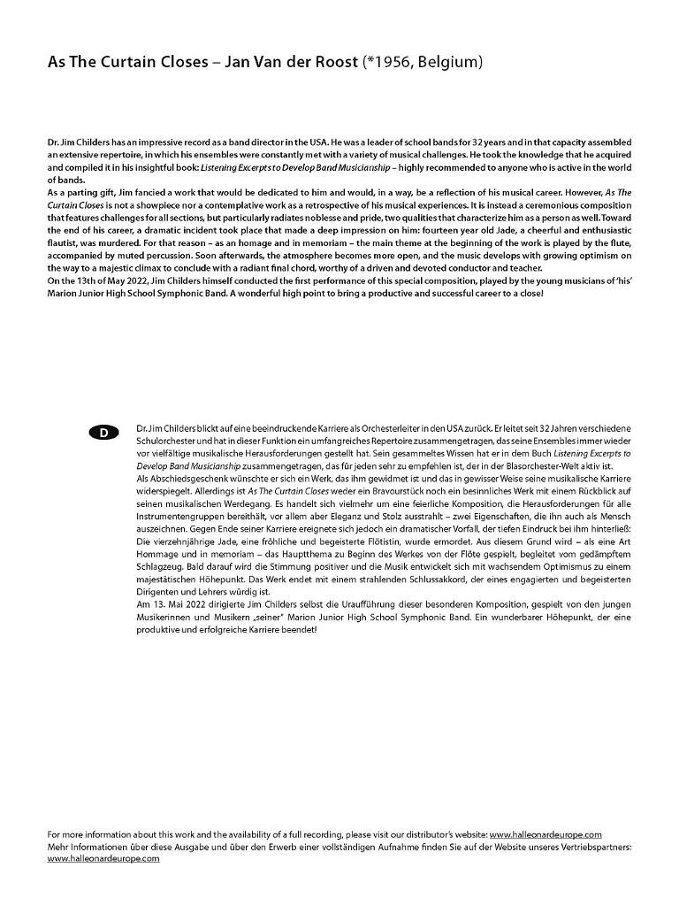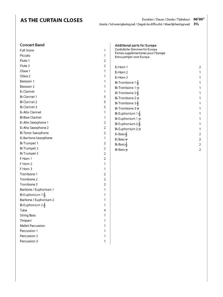 As The Curtain Closes est une composition solennelle rayonnant de noblesse et de fierté qui présente des challenges à tous les pupitres. Le thème principal du début est introduit par la flûte accompagnée de percussions étouffées. Bientôt, le climat se relâche et la musique se développe dans un optimisme grandissant pour aboutir à un climax majestueux qui s’achève sur un dernier accord étincelant.