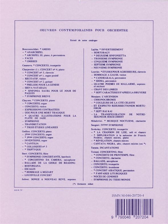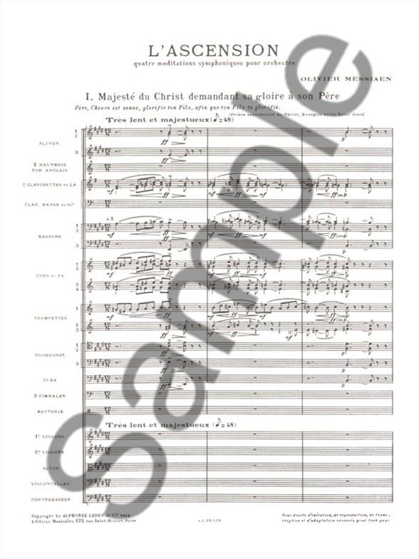This edition of L'Ascension for Orchestra by Olivier Messiaen is the conductor's edition. This religious work lasts approximately 27 minutes and is divided into four parts. I. Majeste du Christ demandant sa gloire à son père (Saint John's Gospel) II. Alleluï as sereins d'une âme qui desire le ciel (Ascension Mass) III. Alleluï a sur la trompette, Alleluï a sur la cymbale (Psalm 46) IV. Prière du Christ montant vers son père (Saint John's Gospel) This piece also exists for Solo Organ. Olivier Messiaen (1908-1992) was a French organist and composer passionate about Ornithology and one of the most important composers of his century. Inspired by Japanese music, he had a very special way of composing and his work can be identified by its complexity, its diatonic aspect, its harmony with limited transposition, its colour and its additive rhythms. He composed many works related to ornithology and birdsong, including the 'Bird Catalogue' in 7 volumes and the 'Treatise on Rhythm, Colour and Ornithology' in 7 volumes.