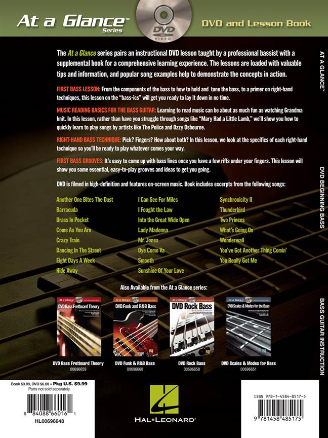 At A Glance - paires de Bass commencer une leçon de DVD pédagogique enseignées par un guitariste professionnel avec un livre supplémentaire pour une expérience d'apprentissage complète. Chaque livre / DVD comporte plusieurs enseignements se rapportant à un sujet, et le salut-def DVD leçons caractéristique de la musique à l'écran. Les leçons sont chargés avec des conseils et des informations utiles et des exemples de chansons populaires permettent de démontrer les concepts dans l'action.