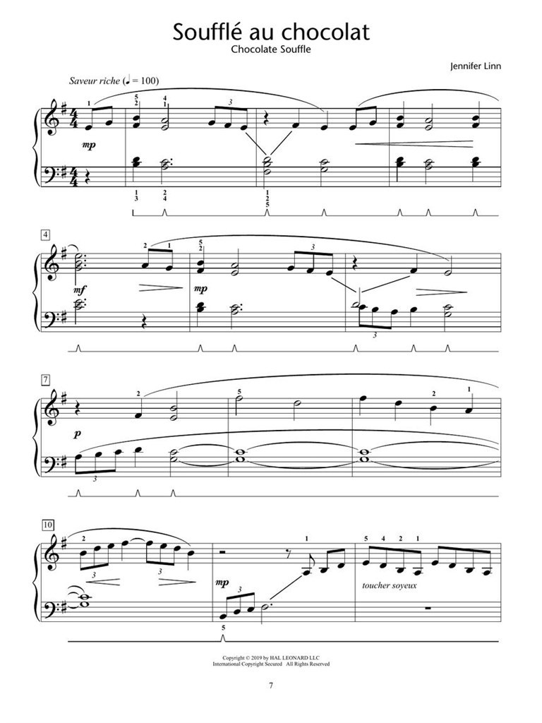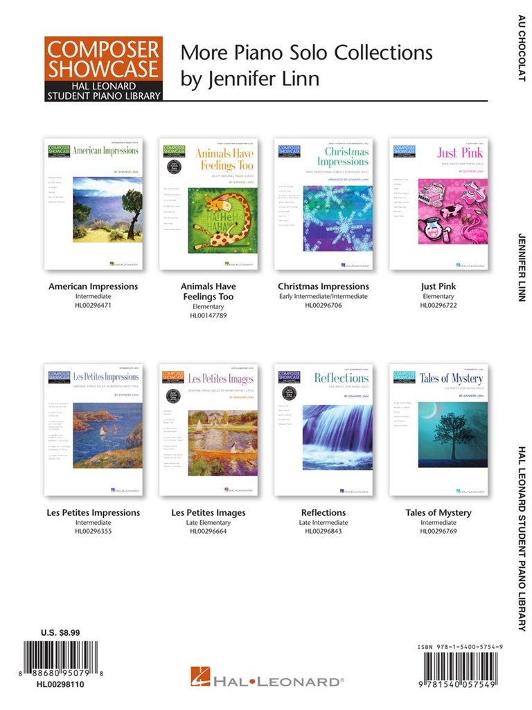 Au Chocolat is a delicious introduction to the beautifully pianistic world of impressionist-style music created by Jennifer Linn. Similar in style to her Les Petites Images and Les Petites Impressions, the marks of expression have been written in French and a glossary is provided in the introductory pages. These seven tasty miniatures feature a variety of keyboard techniques and harmonies that will spark the imagination of students and teachers!