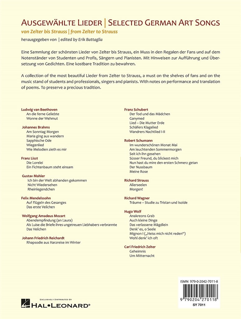 A collection of the most beautiful Lieder from Zelter to Strauss, a must on the shelves of fans and on the music stand of students and professionals, singers and pianists. With notes on performance and translation of poems. To preserve a precious tradition.