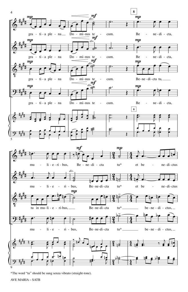 Cette riche mise en musique du texte de l’Ave Maria saisit l’essence de la sincérité et de la transformation à travers la progression des harmonies. Les accords de grappe palpitants incarnent les moments difficiles de la vie alors qu’ils se détendent dans la simplicité de la consonance ouverte. Une œuvre époustouflante pour des chorales mixtes compétentes du lycée et plus !