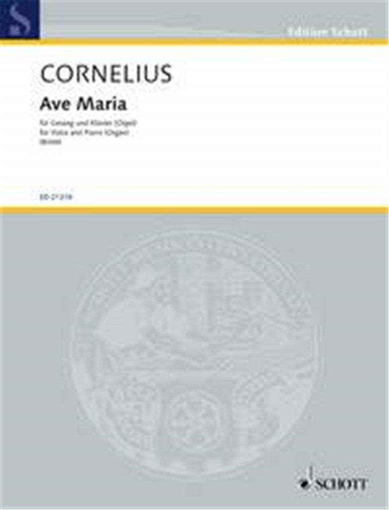 Le compositeur Peter Cornelius (1824-1874) de Mayence souvent appelé lui-même un "poète-compositeur: Toute sa vie, il s'occupa de composer et d'écrire aussi bien. Pas étonnant qu'il s'était consacré en particulier à la composition de chansons, déjà en temps de ses études à Berlin dans les années 1840 en retard. La nouvelle édition "Ave Maria" a été trouvé parmi les oeuvres inédites du compositeur. Bien qu'il porte le dévouement Fräulein '13 von zum Hillebrandt. Septembre 1862 ", il a probablement été créé plus tôt. Il s'agit d'un simple, chanson accompagnée chordally qui est tout à fait adapté à des fins liturgiques. La partie de piano peut être remplacé par un organe.