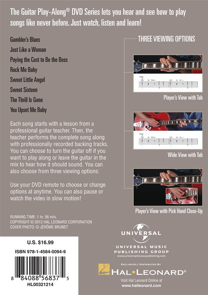 La série DVD Guitar Play-Along vous permet d’entendre et de voir comment jouer des chansons comme jamais auparavant. Regardez, écoutez et apprenez ! Chaque chanson commence par une leçon donnée par un professeur de guitare professionnel. Ensuite, le professeur interprète la chanson complète accompagnée de pistes d’accompagnement enregistrées professionnellement. Vous pouvez choisir d’éteindre la guitare si vous voulez jouer en même temps ou de laisser la guitare dans le mix pour entendre comment elle doit sonner. Vous pouvez aussi choisir parmi plusieurs options de visionnage ; main des frettes avec tab, vue large avec tab, crochet et main en gros plan, et d’autres. Comprend : Gambler’s Blues • Just like a Woman • Payer le prix pour être le patron • Rock Me Baby • Sweet Little Angel • Sweet Sixteen • The Thrill Is Away • You Got Me Up, Baby. 1 h, 56 min.