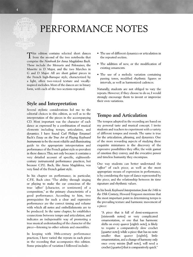 Une sélection de 12 pièces à partir de la plus célèbre bloc-notes de clavier dans l'histoire de la musique, présenté ici dans le cadre de la bibliothèque de Piano de Hal Leonard étudiant. Le Anna Magdalena Notebook est un ensemble de pièces didactiques, composée par J.S. Bach comme matériel de pratique pour sa seconde épouse particulièrement intime et inhabituel. Tel un carnet aurait été monnaie courante dans toute maison musical, contenant une grande variété de musique souvent transcrite par les étudiants eux-mêmes, et qui se développera un répertoire initial. Par sa nature même, cet ensemble de pièces est devenue une source vitale de l'information au sujet de clavier d'enseignement à l'époque Baroque et surtout en ce qui concerne les méthodes et pensée derrière un des plus grands compositeurs du monde. Cette sélection spéciale, convenant à n'importe quel étudiant de Piano intermédiaire au début, a été éditée par Christos Tsitsaros, qui effectue tous les 12 pièces sur le CD qui l'accompagne.
