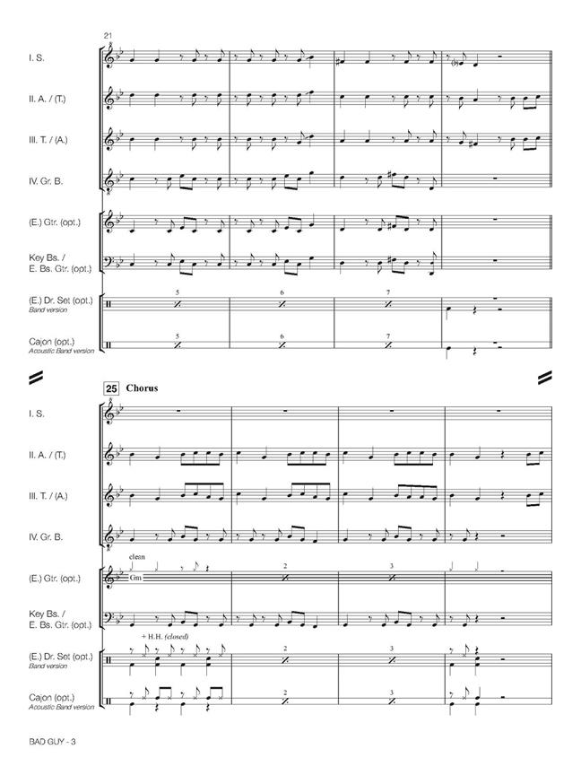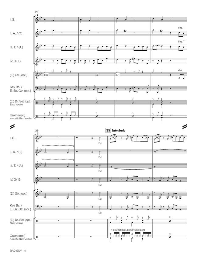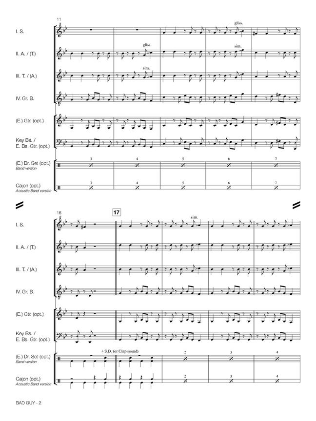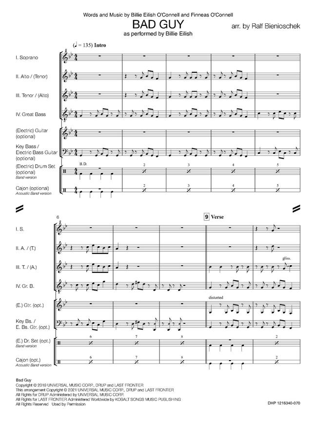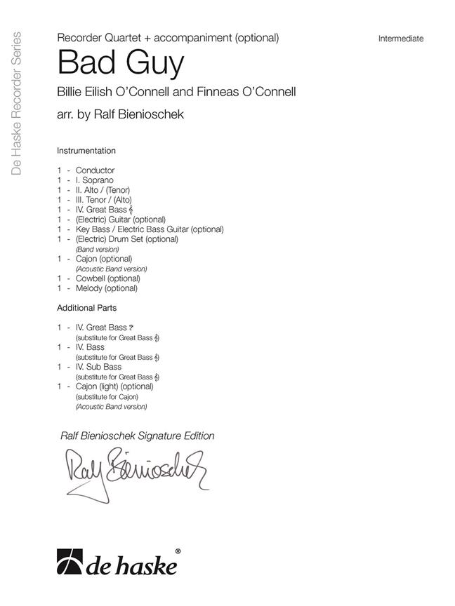 Avec Bad Guy, Billie Eilish a remporté les Grammy Awards de la chanson de l’année et de l’enregistrement de l’année. Cet arrangement a été réalisé par Ralf Bienioschek, un célèbre soliste et professeur de flûte à bec allemand, pour sa série « Ralf Bienioschek Signature Edition ». L’arrangement est destiné à un quatuor standard comprenant soprano, alto, ténor et grande-basse, avec des parties supplémentaires fournies pour basse et soubasse (contrebasse). Le présent ouvrage comprend des parties optionnelles pour clavier électronique, guitare électrique, guitare western, basse électrique, batterie électronique, cajon (simple ou version plus difficile) et cloche, ainsi qu’un play-back (tous disponibles sur notre site web www.bandmusicshop.com). Vous trouverez aussi une démo Score Play et une vidéo « Comment jouer » sur notre chaîne YouTube – Hal Leonard Europe Ensemble. Cette pièce peut être interprétée de différentes manières. En principe, de nombreuses options s’offrent à vous, par exemple - quatuor de flûtes à bec standard - avec un groupe amplifié: guitare, clavier et basse électriques, batterie électronique, cloche. - avec un groupe acoustique: guitare, basse électrique, cajon, cloche - ou flûtes à bec seulement avec ou sans le play-back. J’espère que vous prendrez plaisir à jouer cet arrangement!