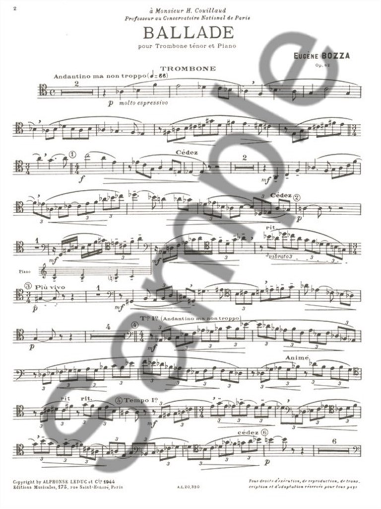 Bozza (1905-1991) was a brilliant student at the Paris Conservatoire, winning prizes for the Violin, conducting and composing, as well as the Grand Prix de Rome. He predominantly composed chamber music for wind, but his solo works for the instruments are also held in high esteem, such as his Ballade for Trombone and Piano. This Bozza piece was originally composed for conservatoire students, displaying the technical skills as well as musicality of the soloist. There is no formal structure to Ballade, however, the many changes in tempo provide variety throughout. With no distinct musical theme unifying the music, it is interesting to note that much of the material of Bozza 's Ballade is extracted from orchestral excerpts. Ballade is an ideal performance piece for advanced trombonists.