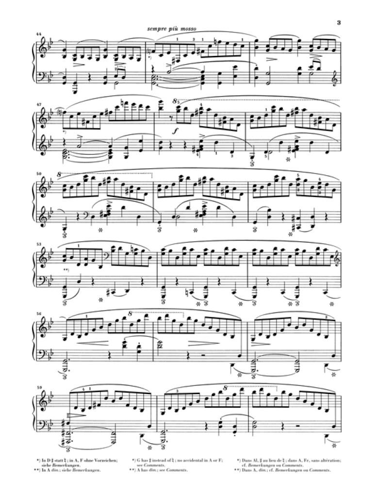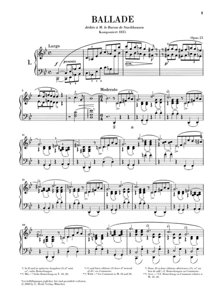 Si, autrefois, le terme «Ballade» s’employait uniquement en littérature et pour la musique vocale, il fut introduit en 1836 par Chopin dans la musique de piano, avec la publication de sa Ballade op. 23. Et en effet, les quatre Ballades de Chopin présentent toutes le caractère d’un récit dramatique: le fil conducteur musical se déroule du début à la fin selon une tension croissante pour aboutir à un apogée grandiose. Après les «Préludes», nous avons aussi soumis cette édition à une révision approfondie en fonction de l’état actuel de la recherche musicologique relative à l’oeuvre de Chopin. L’appareil critique imprimé regroupe les principales données de la recherche.