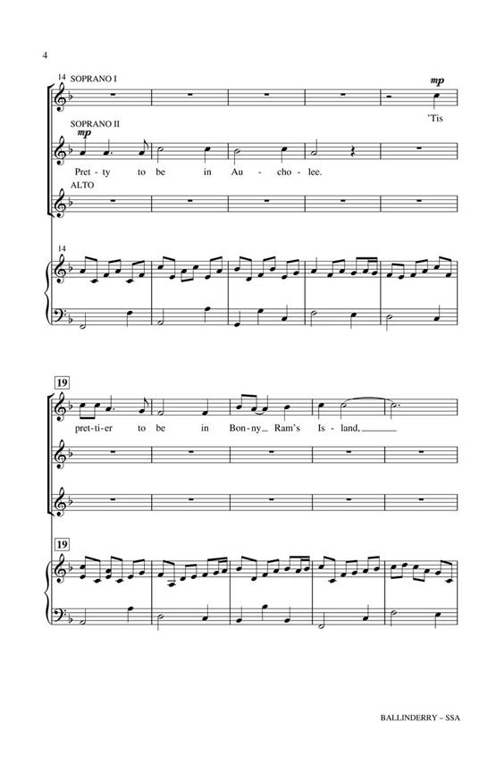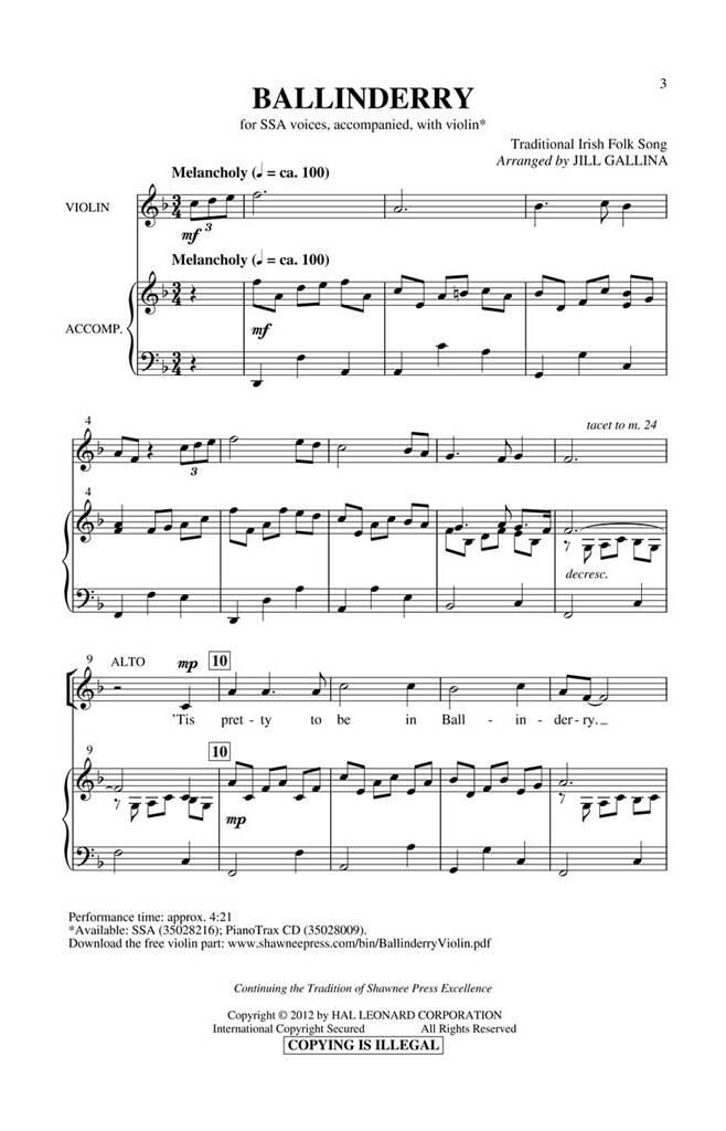 Melancholy Ballinderry est une magnifique chanson folklorique celtique qui raconte la triste histoire de Marie, dont le bien-aimé Phelim est perdu en mer. Une partie de violon est incluse avec l’accompagnement de piano fluide, faisant de cette sélection une charmante sélection multiculturelle pour les voix SSA. La partie violon est disponible en téléchargement gratuit sur www.shawneepress.com/bin/BallinderryViolin.pdf. Disponible : SSA ; CD PianoTrax. »