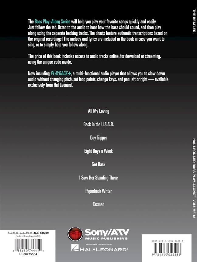 The Bass Play-Along series will help you play your favorite songs quickly and easily! Just follow the tab, listen to the online audio to hear how the bass should sound, and then play along using the separate backing tracks. The melody and lyrics are included in the book in case you want to sing, or to simply help you follow along. The online audio is available for streaming or download using the unique access code printed inside the cover.