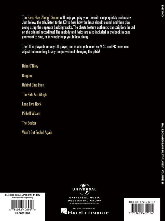 La Basse Play-Along série vous aidera à jouer vos chansons préférées rapidement et facilement! Il suffit de suivre l'onglet, écouter le CD pour entendre comment la basse doit sonner, puis jouer en utilisant la piste d'accompagnement séparée. La mélodie et les paroles sont incluses dans le livre au cas où vous voulez chanter, ou tout simplement pour vous aider à suivre. Le CD audio est jouable sur n'importe quel lecteur CD, et a également amélioré afin que les utilisateurs PC et Mac peuvent ajuster l'enregistrement à n'importe quel tempo sans changer la hauteur! Comprend 8 Qui classiques: Baba O'Riley Bargain - - - Behind Blue Eyes The Kids Are Alright - Longue Live Rock - Pinball Wizard - Le Seeker - Ne Get Fooled Again. plus encore.