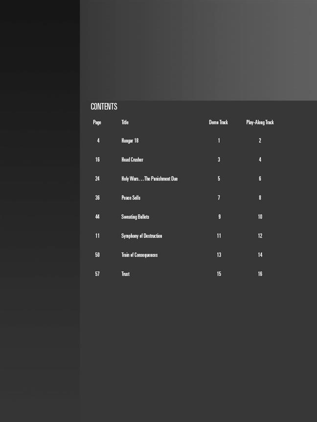 This book includes the songs Hangar 18, Head Crusher, Holy Wars...The Punishment Due, Peace Sells, Sweating Bullets, Symphony Of Destruction, Train Of Consequences and Trust.