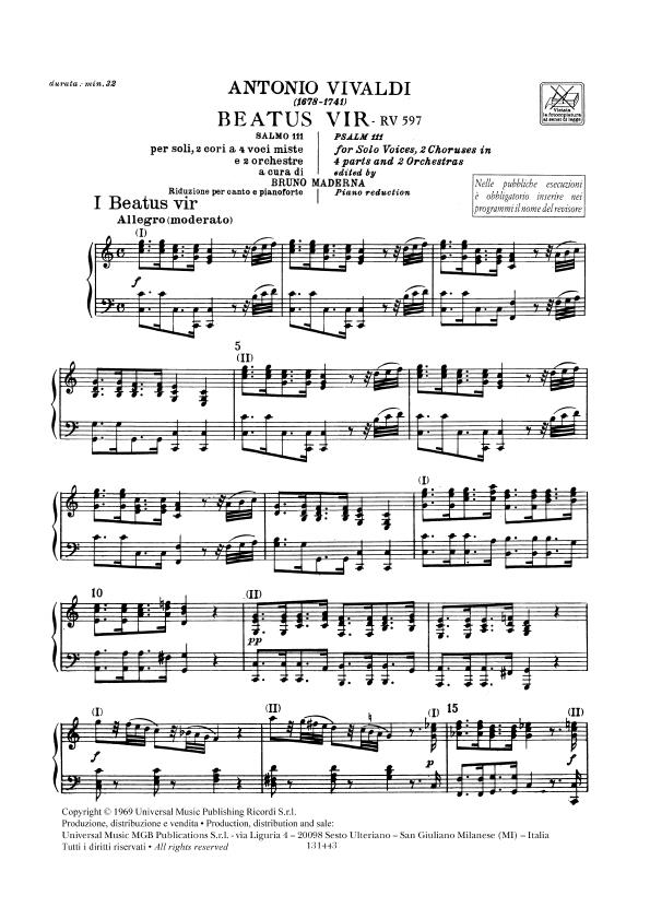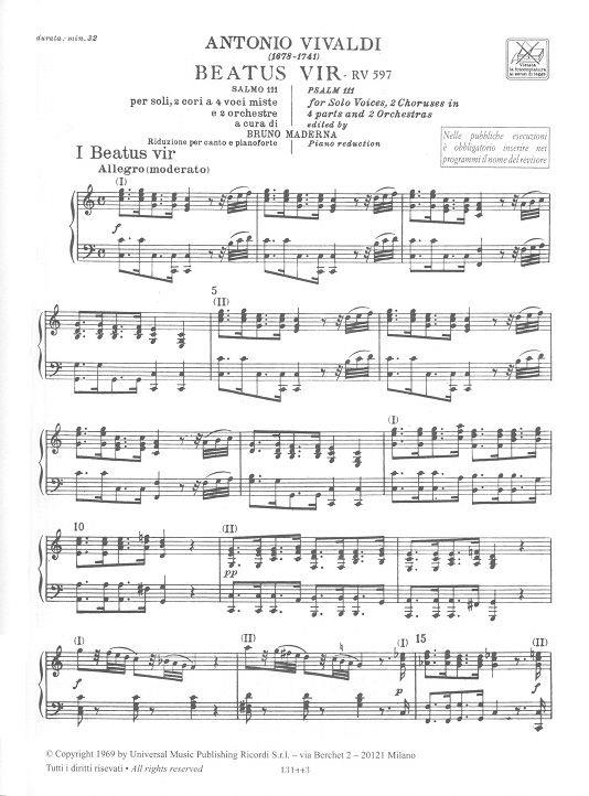 Beatus Vir. Salmo 111 Per 2 S. E T. Solisti, 2 Cori A 4 Voci Miste E 2 Orch. Rv 597 (Coro E Piano) VIVALDI ANTONIO