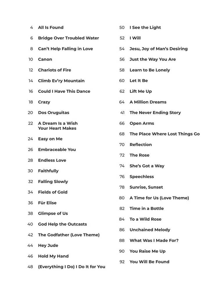 All Is Found Bridge Over Troubled Water Can’t Help Falling In Love Canon In D Chariots Of Fire Climb Ev’ry Mountain Could I Have This Dance Crazy Dos Oruguitas A Dream Is A Wish Your Heart Makes Easy On Me Embraceable You Endless Love (Everything I Do) I Do It For You Faithfully Falling Slowly […]