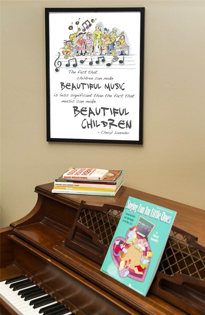 Affiche colorée et illustrée de 18 x 24 pouces avec la citation inspirante de Cheryl Lavender : « Le fait que les enfants puissent faire de la belle musique est moins important que le fait que la musique puisse faire de beaux enfants. »