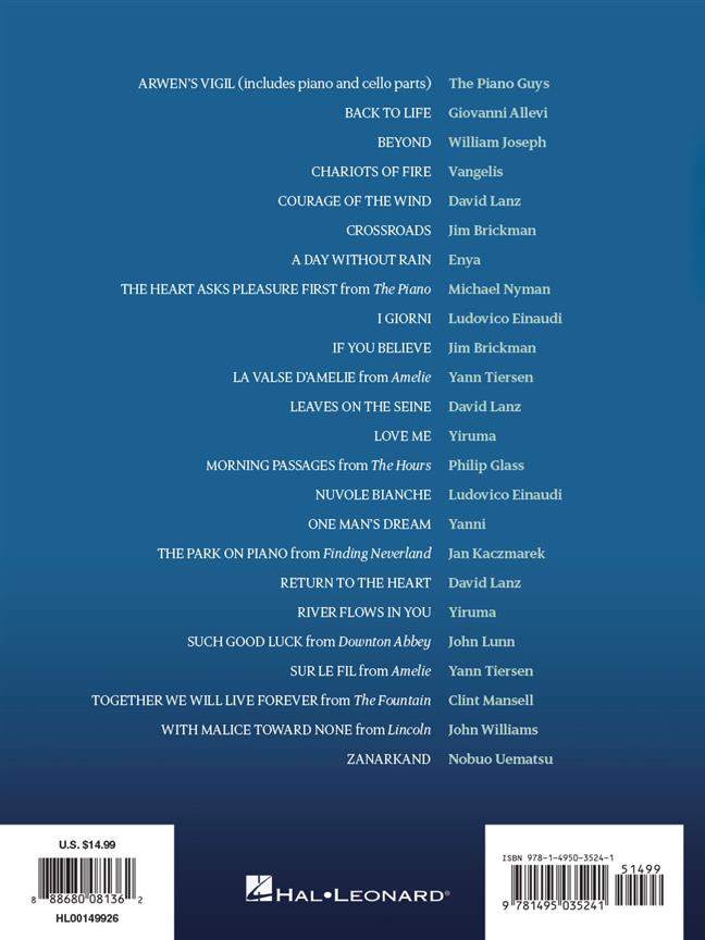 This collection needs no words to express beauty. 24 piano solo arrangements of relaxing piano music, and as a bonus, one arrangement includes the cello part (Arwen's Vigil)! Featuring: Back to Life (Giovanni Allevi) · Beyond (William Joseph) · Chariots of Fire (Vangelis) · A Day Without Rain (Enya) · The Heart Asks Pleasure First (from The Piano) · I Giorni (Ludovico Einaudi) · If You Believe (Jim Brickman) · La Valse d'Amalie (from Amelie) · Leaves on the Seine (David Lanz) · One Man's Dream (Yanni) · River Flows in You (Yiruma) · Zanarkand (Nobuo Uematsu) · and more!