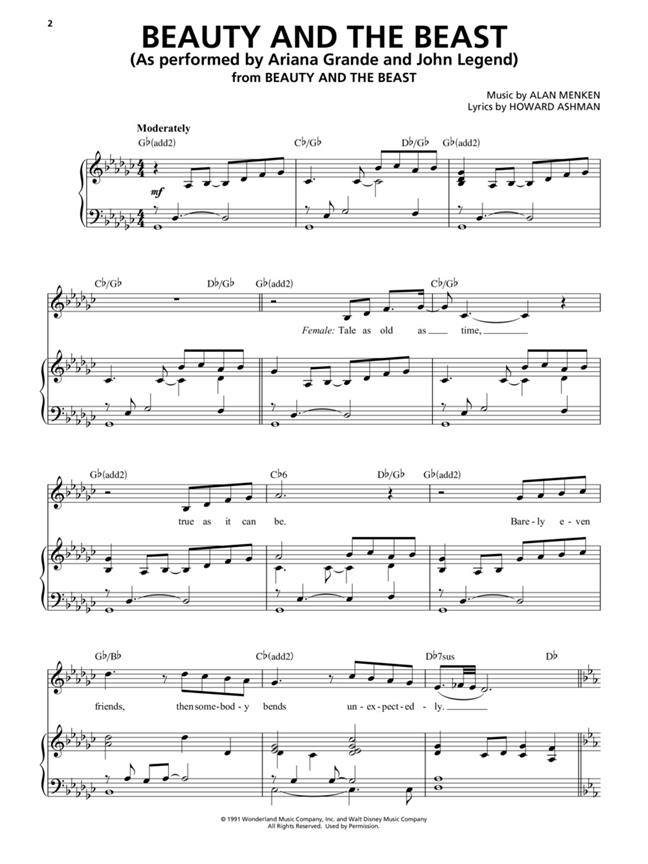 Chantez avec un orchestre complet ! Le morceau-titre d’Alan Menken et Howard Ashman, initialement écrit pour le film d’animation Disney dans les années 1990, a été modernisé dans un nouveau cadre interprété par Ariana Grande et John Legend pour le film live action de 2017, présenté en version imprimée sous forme d’arrangement solo vocal accompagné au piano. Il inclut également l’accès à un accompagnement en ligne entièrement orchestré à télécharger ou à streamer pour que vous puissiez chanter en même temps et paraître comme un pro ! L’audio en ligne est accessible à halleonard.com/mylibrary