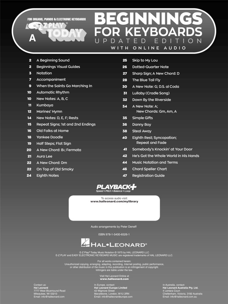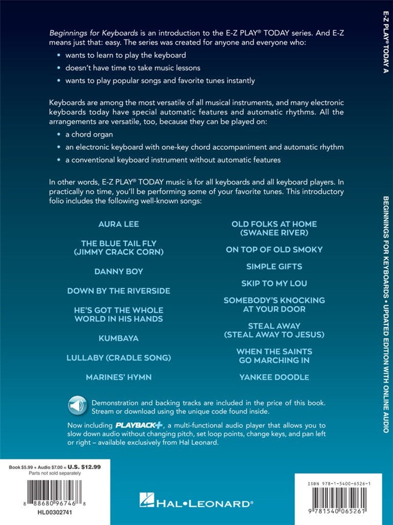 Introducing the E-Z way to reading music notes, chords, and learning musical terms! Keyboards are among the most versatile of all musical instruments, and many electronic keyboards today have special automatic features and automatic rhythms. These features make making music even more fun and versatile! If you've always wanted to learn how to play the keyboard, this book is your first step to success! Beginnings Book A provides easy-to-understand instructions with popular songs and favorite tunes so you can start playing music you know and love while learning to play! In practically no time, you'll be performing some of your favorite standards, including: Aura Lee · DannyBoy · He's Got the Whole World in His Hands · Kumbaya · Lullaby (Cradle Song) · On Top of Old Smoky · Simple Gifts · When the Saints Go Marching In · Yankee Doodle · and more. This book also includes access to online recordings of demonstration and backing tracks, so you can listen to the demos to hear how the piece should sound, then play along with the backing tracks to sound like a pro! Audio is accessed online using the unique code inside the book and can be streamed or downloaded. The audio files include PLAYBACK+, a multi-functional audio player that allows you to slow down audio without changing pitch, set loop points, change keys, and pan left or right.