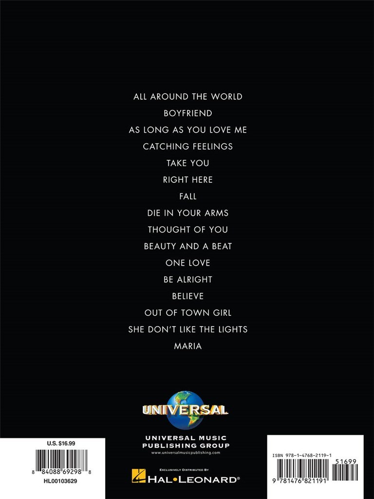 Y compris des hits tels que Boyfriend, As Long As You Love Me et Beauty And A Beat, et savamment arrangé pour Piano, Voix et Guitare, ce songbook gardera toute musical "Belieber" heureux pendant des heures.