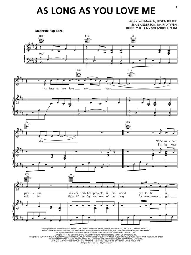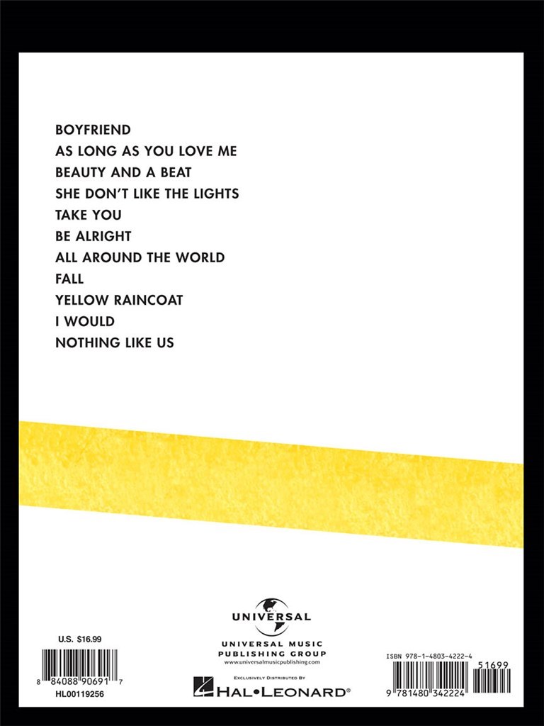 Ce livre de chanson comprend partition de partout dans le monde, aussi longtemps que vous m'aimez, Beauty and a Beat, Boyfriend, et plus encore.