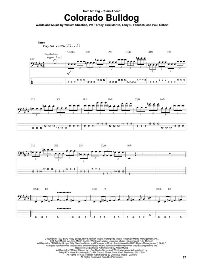 The masterful performances of Billy Sheehan on bass are featured in 14 note-for-note transcriptions with tab for bass in this folio. It includes Sheehan's solo efforts (Chameleon and 2 others) as well as his bass parts from the rock bands Mr. Big (Addicted to That Rush and 4 more), Talas (High Speed on Ice and NV43345), and Niacin (Elbow Grease), plus David Lee Roth (Yankee Rose and 2 others).