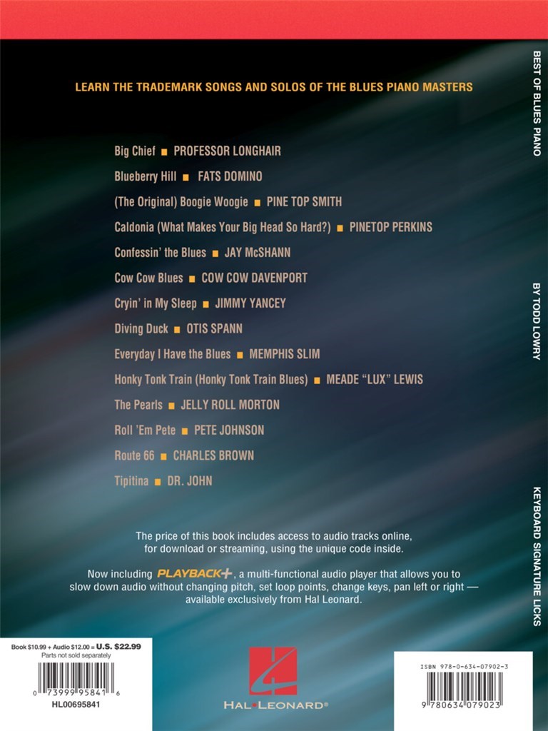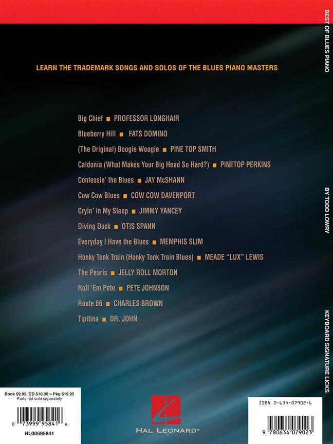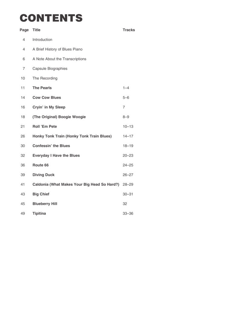 Une plongée au coeur du style blues au piano par l'étude de 14 morceaux emblématiques de Dr. John, Pete Johnson, Professor Longhair, Pinetops Perkins et bien d'autres. Sur le cd joint, les versions jouées et play-back de toutes les chansons de la méthode. Titres : Big Chief (Professor Longhair) - Blueberry Hill (Fats Domino) - Pine Top's Boogie (Pine Top Smith) - Caldonia (What Makes Your Big Head So Hard?) (Pinetops Perkins) - Confessin' The Blues (Jay McShann) - Cow Cow Blues (Cow Cow Davenport) - Cryin' In My Sleep (Jimmy Yancey) - Diving Duck (Otis Spann) - Every Day I Have The Blues (Memphis Slim) - Honky Tonk Train (Honky Tonk Train Blues) (Meade "Lux" Lewis) - The Pearls (Jelly Roll Morton) - Roll 'em Pete (Pete Johnson) - Route 66 (Charles Brown) - Tipitina (Dr. John)