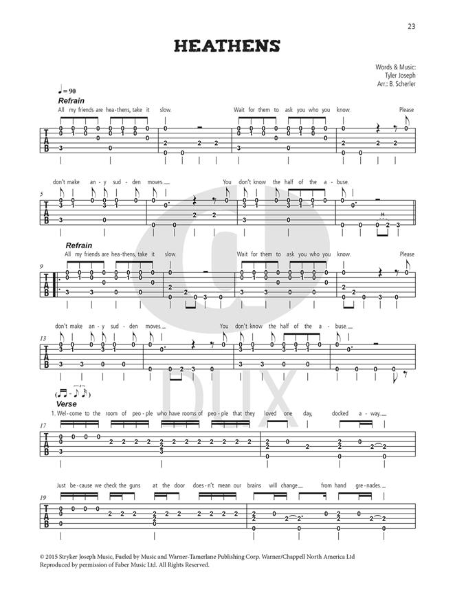 Rock for Classical Guitar” series. All eight songs are arranged for solo guitar and written in both musical notation and in tablature form. A lead sheet is also provided for each song with suggestions for strumming and picking. Demons (Imagine Dragons) · Heathens (Twenty One Pilots) · Hero (Family Of The Year) · Million Years Ago (Adele) · There'