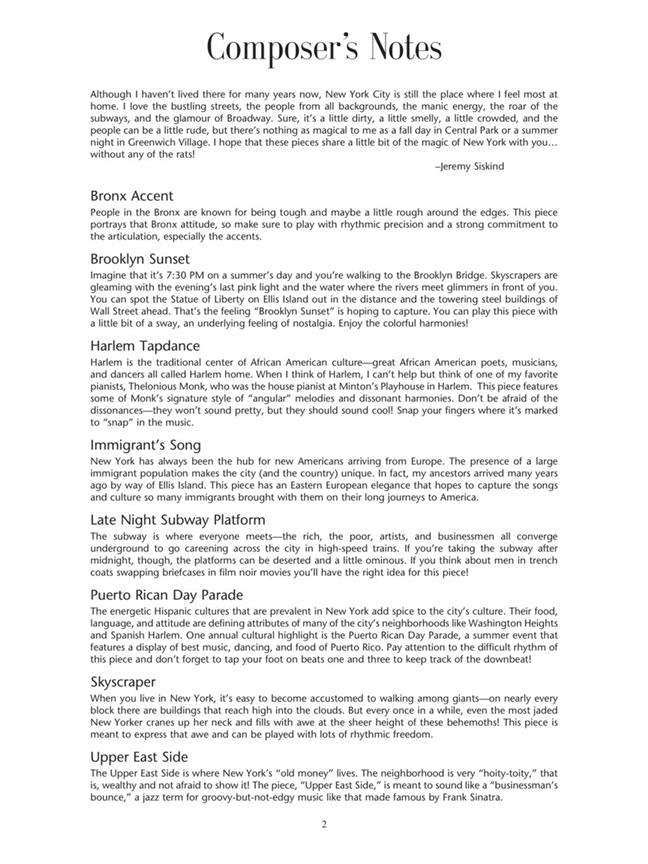 Eight original piano solos at an intermediate level with the flair of New York City: Includes composer notes for each piece.