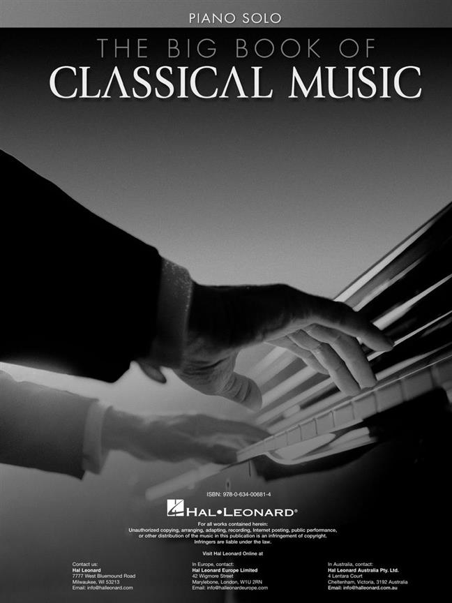 Tous vos favoris Piano chefs-d'oeuvre dans une collection pratique ! Ce livre caractéristiques solo arrangements de 100 classiques de Bach, Beethoven, Bizet, Brahms, Chopin, Debussy, Delibes, Dvorák, Fauré, Franck, Gounod, Grieg, Haendel, Haydn, Mahler, Mendelssohn, Mozart, Pachelbel, Puccini, Tchaikovsky, Verdi, Vivaldi, Wagner et plus !