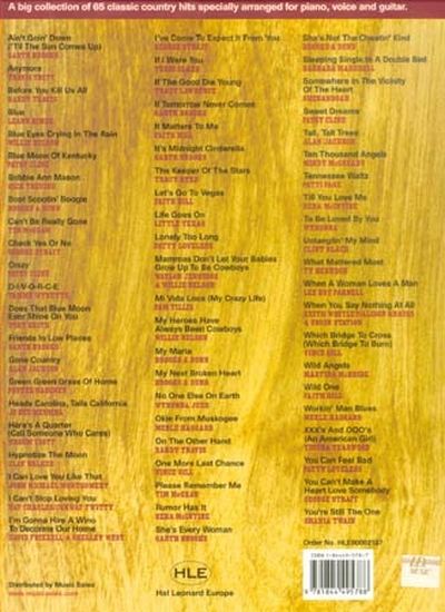 Une grande collection de 65 pays classique hits spécialement adaptés pour piano, voix et guitare. Comprend des chansons par Garth Brooks, Tim McGraw, Faith Hill, Willie Nelson et beaucoup d'autres