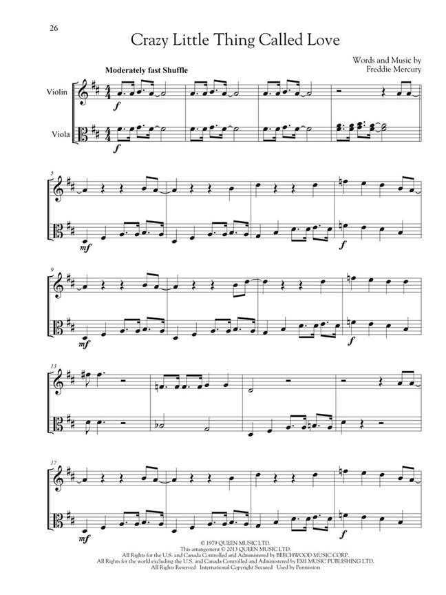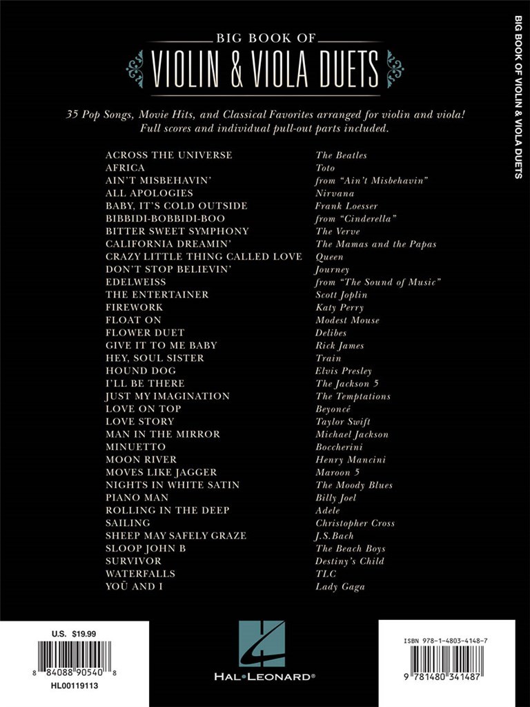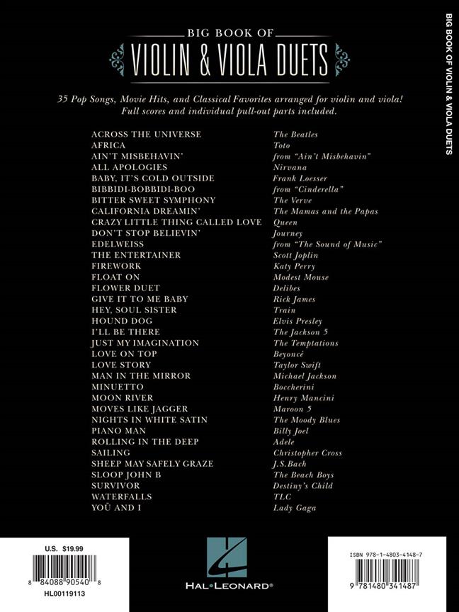 The Big Book Of Violin and Viola Duets includes sheet music for 35 favourite pop songs, movie hits and classical pieces, including Across the Universe, Baby, It's Cold Outside, California Dreamin', Crazy Little Thing Called Love, Don't Stop Believin', Hey, Soul Sister, Hound Dog, Moon River, Moves like Jagger, You and I and more.