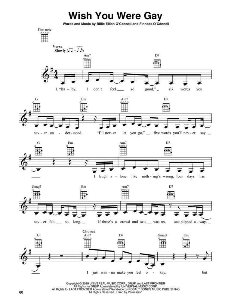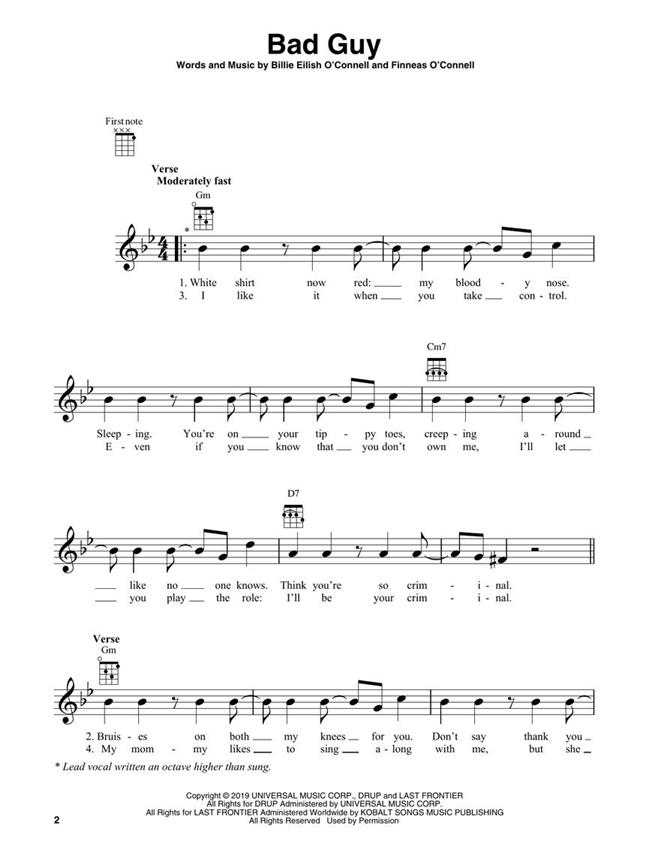 Les plus grands tubes de Billie Eilish maintenant disponibles pour une variété d’instruments. Sommaire : Bad Guy Lovely • Everything I Wanted • No Time to Die • Ocean Eyes et plus. Mélodie, paroles et diagrammes d'accords pour 17 chansons de Billie Eilish en notation ukulélé standard Sol-Do-Mi-La.