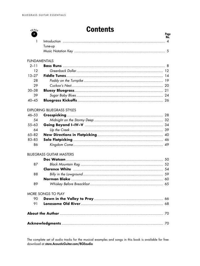 Apprendre les rudiments de la musique bluegrass en explorant ses divers styles et les maîtres qui a défini le genre : Doc Watson, Clarence White et Norman Blake. Le livre comprend des renseignements généraux, d'instruction et de 12 chansons classiques, tandis que le CD comprend des démos, des exercices et chansons.